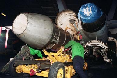 | Keywords: 011220-N-3896H-004 F-110 jet engine.jpg en 011220-N-3896H-004 At sea aboard USS Theodore Roosevelt CVN 71 Dec 20 2001 -- Aviation Machinist sMate 1st Class Eddie Quarles from Detroit Mi and Aviation Machinist s Mate 3rd Class Juan Martinez from the Dominican Republic work together aboard USS Theodore Roosevelt to place an F-110 jet engine into an F/A-18 Hornet The Roosevelt in deployed in support of Operation Enduring Freedom U S Navy Photo by Photographer s Mate 2nd Class Jeremy Hall RELEASED NOTE This is the Navy's caption but it's wrong in at least 1 respect see discussion page 011220-N-3896H-004 Navy http //www navy mil/view_image asp id 282 U S Navy Photo by Photographer s Mate 2nd Class Jeremy Hall PD-USGov-Military-Navy USS Theodore Roosevelt CVN-71 hangar deck Aviation Machinist's Mate Maintenance of military aircraft |