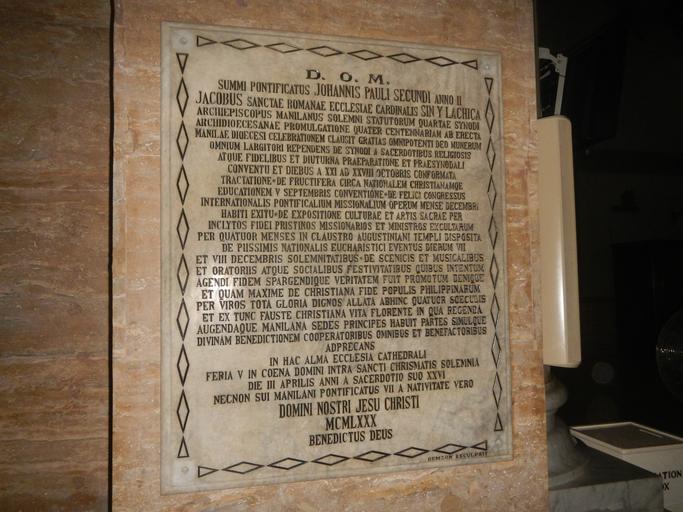 | Keywords: 01891jfManila Cathedral Basilica Intramuros Manila Bells Landmarksfvf 02.jpg Intramuros Landmarks include the Manila Cathedral Rufino J Cardinal Santos Bell Garden Jaime L Cardinal Sin Ground Belfry 7 big bells 17 tons from the Bell Tower Belfry foundered by Friedrich Wilhelm Schilling 1 of the 7 bells is bigger than the Pan-Ay Bell the now 2nd largest in Philippines Archbishop Gabriel M Reyes Audio-Visual Room Carillon Bells Parish Office Rectory Interior of the Manila Metropolitan Cathedral-Minor Basilica of the Immaculate Conception re-opened on April 9 2014 after structural retrofitting architectural restoration and engineering enhancements Plaza de Roma Intramuros King Charles IV of Spain monument Intramuros Ž along Genral Luna Real de Palacio Street corner A Soriano Jr Avenue formerly Aduana corner Arzobizpo Street; Intramuros Fire Station Bureau of Fire Protection Plaza de Roma 1824 bronze statue of Carlos IV of Spain 1886 Fountain; Main facade-Clock Tower-Belfry; Note Judge Florentino Floro the owner to repeat Donor Florentino Floro of all these photos hereby donate gratuitously freely and unconditionally all these photos to and for Wikimedia Commons exclusively for public use of the public domain and again without any condition whatsoever 2016-09-08 13 16 08 own Judgefloro other versions Interior of the Manila Metropolitan Cathedral-Minor Basilica of the Immaculate Conception |
