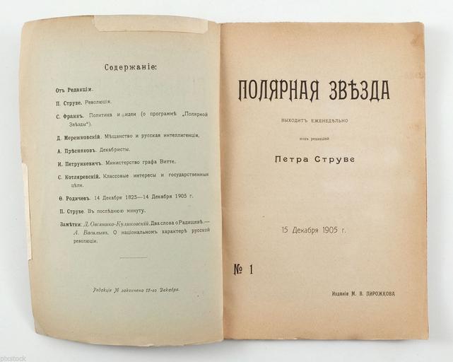 | Keywords: Полярная Звезда. №01. (1905) — Титул. лист и содерж.jpg Титульный лист и ст аница соде жания жу нала «Поля ная Звезда» 1 1905 «Поля ная Звезда» еженедельный жу нал выходивший под ед П Ст уве с 15 декаб я 1905 г по 19 ма та 1906 г Всего вышло 14 номе ов 1906 http //www ebay ca/itm/1905-Imperial-Russia-Russian-Magazine-by-Struve-1-FIRST-ISSUE-/311377827655 Редакто Пёт Бе нга дович Ст уве PD-RusEmpire Polyarnaya zvezda 1905 1906 Title pages uploaded by Steven Pavlov from various sources | ||||