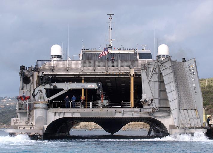 Keywords: 060112-N-0780F-004.jpg en 060112-N-0780F-004 Souda Bay Crete Greece Jan 12 2006 - The U S Navy High-Speed Vessel HSV-2 Swift departs Souda Bay Crete following a brief port visit Swift is assigned to Commander Mine Warfare Command COMINEWARCOM Ingleside Texas and is operated by two rotating 42-person crews A Gold-crew based at Little Creek Va concentrates on expeditionary missions while a Blue-crew from Ingleside focuses on mine warfare At 321 feet Swift has a top speed of almost 50 knots The catamaran's aluminum hulls draw only about 11 feet of water making the ship ideal for missions in shallow coastal regions U S Navy photo by Mr Paul Farley RELEASED http //www navy mil/view_image asp id 31263 U S Navy photo by Mr Paul Farley RELEASED 2006-01-12 PD-USGov-Military-Navy Images by Alaniaris/PD uploads General views of HSV-2 Swift