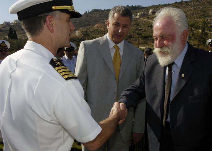 | Keywords: 060523-N-9742R-160.jpg en 060523-N-9742R-160 Souda Bay Crete May 23 2006 - Nuclear-powered aircraft carrier USS Enterprise CVN 65 Commanding Officer Capt Larry Rice meets Mr Georgious Kopasis the most highly decorated World War II veteran of the Battle of Crete at an official wreath-laying ceremony at the Souda Bay WWII Veterans Cemetery to commemorate the anniversary of the Battle of Crete during a port call to Souda Bay The Enterprise Carrier Strike Group is on a scheduled six-month deployment in support of the global war on terrorism While in the Naval Forces Europe Area of Responsibility the Strike Group will conduct training and theater security cooperation engagements with several countries including Bulgaria Germany Croatia and Greece U S Navy photo by Photographer's Mate 2nd Class Milosz Reterski RELEASED http //www navy mil/view_image asp id 34852 U S Navy photo by Photographer's Mate 2nd Class Milosz Reterski RELEASED 2006-05-23 PD-USGov-Military-Navy Images by Alaniaris/PD uploads People of Crete |