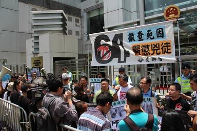 Keywords: 07 June 2012 protests for Li Wangyang voa.jpg en On 7 June 2012 several Hong Kong organisations protest outside the Central Government Liaison Office to demand a thorough investigation into the death of Li Wangyang a dissident who was found dead on 6 June zh 2012年6 7日,多 香港 體遊行到中聯辦要求徹查6 6日身亡的 旺陽死因 2012-06-07 http //www voacantonese com/content/china-dissident/1204404 html Voice of America PD-USGov-VOA June 2012 in Sai Ying Pun Visitors LOCPG HKSAR Li Wangyang |