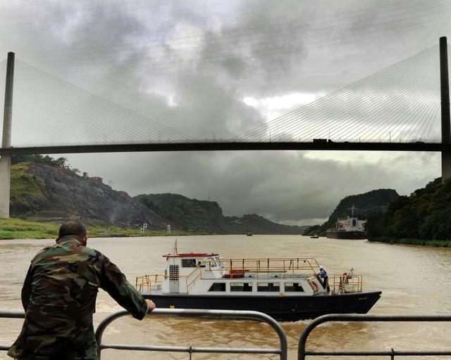 Keywords: 081130-N-9995B-001.jpg en 081130-N-9995B-001 PANAMA CANAL Panama Nov 30 2008 Chief Hospital Corpsman Edmund Reyes watches a ferry boat as canal line handlers prepare to board the high speed vessel Swift HSV 2 during a transit of the Panama Canal Swift is the primary platform for Southern Partnership Station a military to military training mission to Central America South America and the Caribbean Basin U S Navy photo by Mass Communication Specialist 1st Class Daniel Ball Released http //www navy mil/view_image asp id 67054 U S Navy photo by Mass Communication Specialist 1st Class Daniel Ball Released 2008-11-30 PD-USGov-Military-Navy Images by Alaniaris/PD uploads Ferries in Panama Aboard HSV-2 Swift Southern Partnership Station 2008 Centennial Bridge Culebra Cut