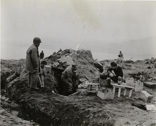 Keywords: outdoor 09-7928-22 First Japs Defense on Attu Fall to Americans. American occupation of the outer ring of Jap defenses on Attu and aerial views of landings made in the combined Army and Navy operations are shown in these pictures made by Navy photographers, 05/17 to 05/21/1943. Examine equipment found in Underground Village - like prairie dog hills on the western plains of the United States with interlacing tunnels were dugouts in which the Japs in Holly Bay area lived until the Americans came to drive them out. U.S. sailors are looking over equipment of a Jap Medical Unit which occupied this hole in the ground. [Medical supplies.] [Soldiers.] [World War 2. Pacific Theater.] [Scene.] WWII Pacific Island Combat General. 05/28/1943 09-7928-22 First Japs Defense on Attu Fall to Americans. American occupation of the outer ring of Jap defenses on Attu and aerial views of landings made in the combined Army and Navy operations are shown in these pictures made by Navy photographers, 05/17 to 05/21/1943. Examine equipment found in Underground Village - like prairie dog hills on the western plains of the United States with interlacing tunnels were dugouts in which the Japs in Holly Bay area lived until the Americans came to drive them out. U.S. sailors are looking over equipment of a Jap Medical Unit which occupied this hole in the ground. [Medical supplies.] [Soldiers.] [World War 2. Pacific Theater.] [Scene.] WWII Pacific Island Combat General. 05/28/1943 |