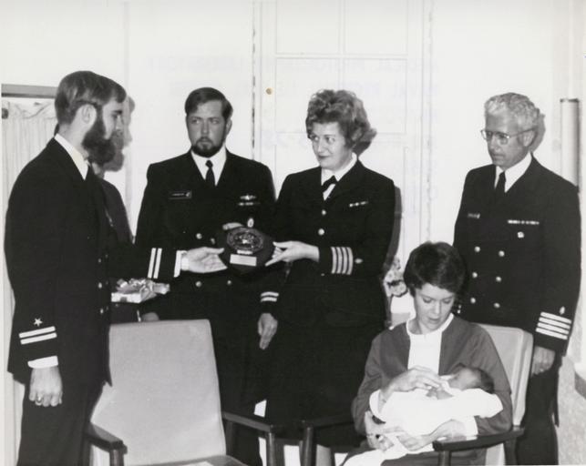 | Keywords: groupshot people indoor blackandwhite black and white 09-8636-11  Johanna Lohrmann has been named Bicentennial Birthday Baby by Naval Regional Medical Center Newport, Rhode Island. The 9 pound 4.5 ounce newcomer was born at the medical center at 0508 on the Navy's 200th birthday. 10/13/1975. Among the gifts awaiting the Bicentennial Birthday Baby were a plaque, a special birth certificate signed by the Navy Surgeon General, and a letter of introduction from the Commander, Naval Recruiting Command, Washington, D.C., for Johanna to use in 1993 when, at age 18, she may wish to join the Navy. Johanna also received gifts from local businesses. Shown above with Lieutenant Lohrmann (left), his wife, and Johann are Lieutenant John McGilbray, Navy Recruiting Office, Providence; Captain Mary T. Lynch (Medical Corps) acting director of clinical services and former editor of U.S. Navy Medicine, and Captain Patrick O'Halloran (Medical Corps), chief of Obstetrics/Gynecology, who was the first to welcome Johanna aboard. [Portraits.] [Scene.] Lynch, Mary, Captain, Medical Corps.  US Navy Medicine 12/1975 09-8636-11  Johanna Lohrmann has been named Bicentennial Birthday Baby by Naval Regional Medical Center Newport, Rhode Island. The 9 pound 4.5 ounce newcomer was born at the medical center at 0508 on the Navy's 200th birthday. 10/13/1975. Among the gifts awaiting the Bicentennial Birthday Baby were a plaque, a special birth certificate signed by the Navy Surgeon General, and a letter of introduction from the Commander, Naval Recruiting Command, Washington, D.C., for Johanna to use in 1993 when, at age 18, she may wish to join the Navy. Johanna also received gifts from local businesses. Shown above with Lieutenant Lohrmann (left), his wife, and Johann are Lieutenant John McGilbray, Navy Recruiting Office, Providence; Captain Mary T. Lynch (Medical Corps) acting director of clinical services and former editor of U.S. Navy Medicine, and Captain Patrick O'Halloran (Medical Corps), chief of Obstetrics/Gynecology, who was the first to welcome Johanna aboard. [Portraits.] [Scene.] Lynch, Mary, Captain, Medical Corps.  US Navy Medicine 12/1975  |