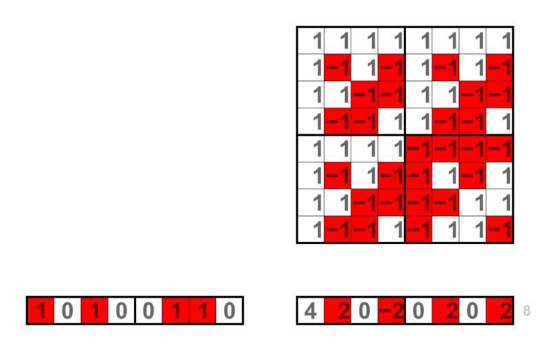 | Keywords: 1010 0110 Walsh spectrum (single row).svg  Walsh spectrum of the 3-ary Boolean function 1010 0110 The binary string is multiplied with a Walsh matrix of order 8 The red squares in the background are additional information and show the product of the binary string with a binary Walsh matrix Compare Figure 1 in http //citeseerx ist psu edu/viewdoc/download doi 10 1 1 74 8029 rep rep1 type pdf Walsh Spectrum Computations Using Cayley Graphs by W J Townsend and M A Thornton Usually in these files the Walsh spectra of all functions in the small equivalence class are shown thumb left 300px Walsh spectra of 8 Boolean functions <br>including 1010 0110 own Lipedia Walsh spectrum of 3-ary Boolean functions |