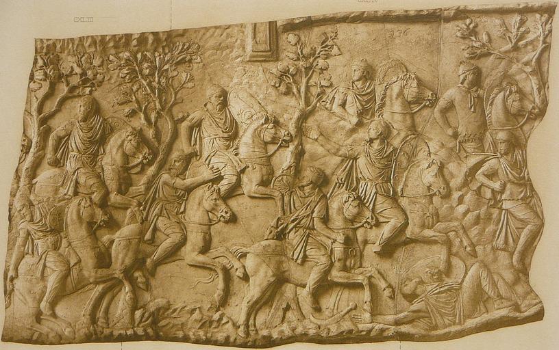 | Keywords: 105 Conrad Cichorius, Die Reliefs der Traianssäule, Tafel CV.jpg attributed to Graphics Die Reliefs der Traianssäule nach Conrad Cichorius Tafel CV Verfolgungsgefecht Szene CXLIII ; Flucht dakischer Reiter Szene CXLIV The Reliefs of Trajan's Column by Conrad Cichorius Plate number CV Fight between pursuers and pursued Scene CXLIII ; Dacians fleeing on horseback in the mountains Scene CXLIV Sculpture AD 113 ; Graphics 1900 Sculpture bas-relief; Graphics monochrome graphics based on photographs Sculpture Institution Trajan's Column object history credit line accession number Conrad Cichorius Die Reliefs der Traianssäule Zweiter Tafelband Die Reliefs des Zweiten Dakischen Krieges Tafeln 58-113 Verlag von Georg Reimer Berlin 1900 other versions 1932 Uncategorized 2015 June 24 |