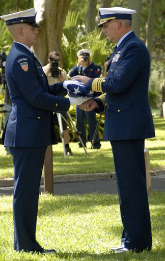 | Keywords: 1078729 FUNERAL SERVICES FOR USCG DIVER LT. JESSICA HILL.jpg en ST AUGUSTINE Fla Aug 23 2006 --Vice Adm Brian Peterman Commander Atlantic Area receives a folded flag from a member of the Coast Guard Ceremonial Honor Guard Aug 23 2006 during a memorial service held in honor of Lt Jessica Hill The flag will be presented to the family in remembrance of her honor respect and devotion to duty to her country and the Coast Guard Lieutenant Hill died while serving aboard the Coast Guard Cutter Healy in the Arctic Ocean during a dive operation USCG photo byPA1 Donnie Brzuska 2006-08-23 https //www dvidshub net/image/1078729/funeral-services-lt-jessica-hill USCG photo byPA1 Donnie Brzuska other versions PD-USGov Coast Guard in Alaska Funerals People wearing military uniforms |