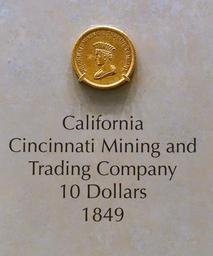 Keywords: 10 Dollars, Cincinnati Mining and Trading Company, California, 1849 - National Museum of American History - DSC00217.jpg en Exhibit in the National Museum of American History Washington DC USA Photography was permitted in the museum without restriction 2015-03-27 11 31 53 own Daderot other versions cc-zero Coins of the California Gold Rush in the National Museum of American History |