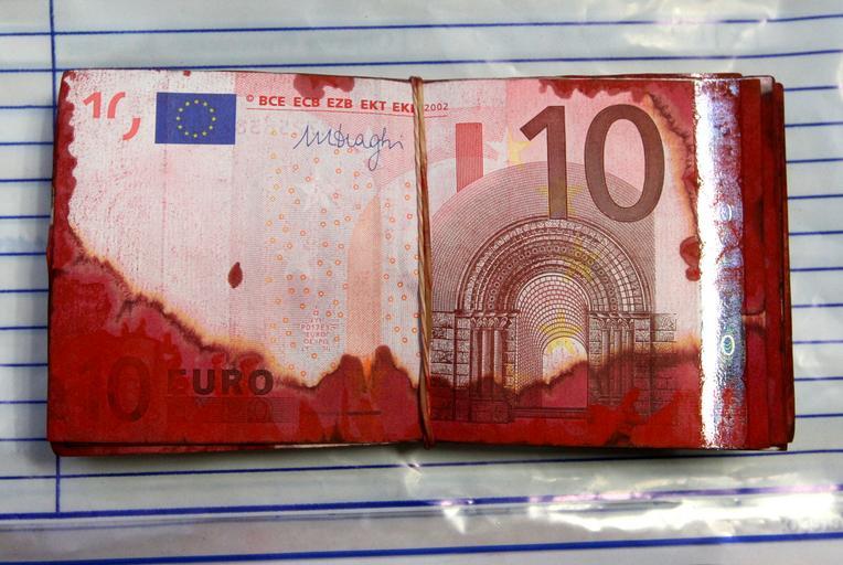 Keywords: 10 euro notes from an ATM robbery.jpg en With red paint made ‹ ‹unusable ‚¬ 10 bills from a cash machine robbery 2012-08-11 own Cruks cc-by-sa-3 0 Money-EU Uploaded with UploadWizard 10 euro banknotes Crime prevention Red