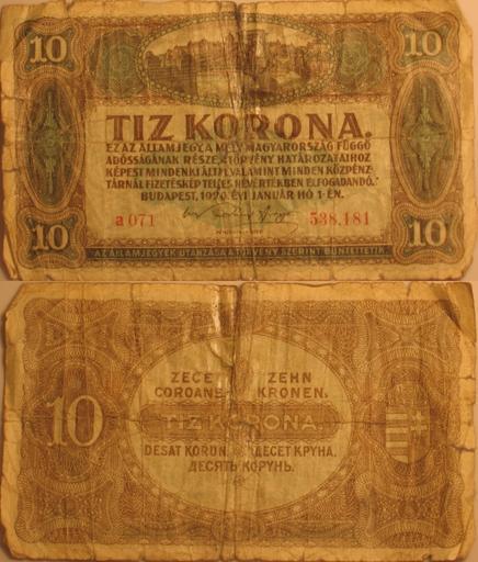 Keywords: 10koronWeg-1920.jpg Hungarian 10 kronen 1920 own scan of an obsolate banknote 1920-01-01 Royal Hungarian State Bank / Hungarian Ministry of Finances Budapest PD-Hungary Julo Banknotes of Hungary korona 000010 1920 Banknotes with a face value of 10
