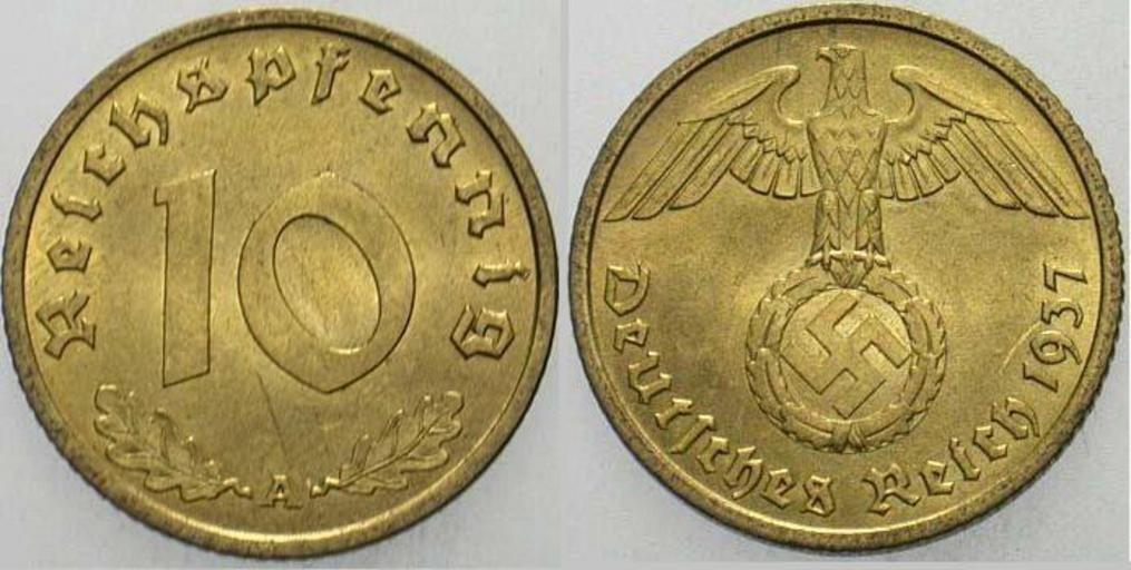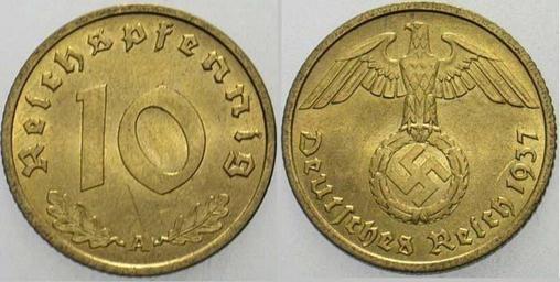 Keywords: 10Reichspfennig1.JPG es Moneda de 10 pfennig Nazi German 10 pfennig 1/100 of a Reichsmark German coin Reichsbank photograph by Turkmenistan 1937 Coin PD-GermanGov-currency <br/>Photograph nazi symbol Reichsmark coins of the Third Reich 0010 1937 |