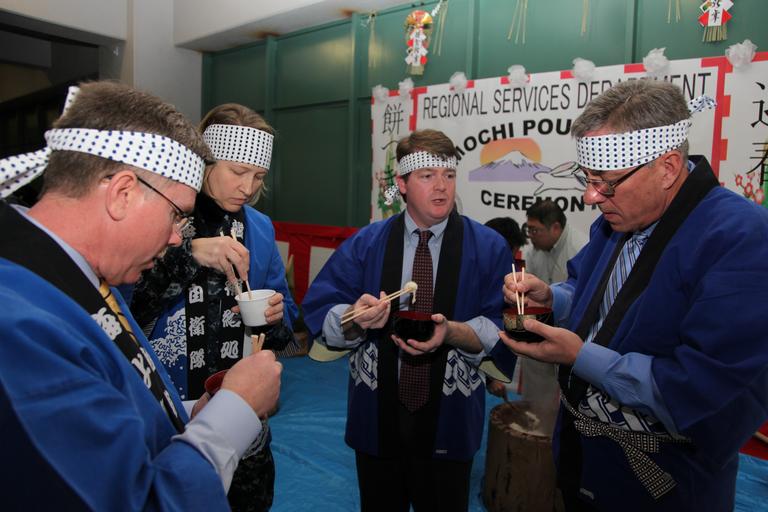 | Keywords: 110111-N-9999O-036 (5349073095).jpg  From left John Goodhart the vice commander of Naval Supply Systems Command; U S Navy Cmdr Karen Little the regional services director of Fleet and Industrial Supply Center FISC Yokosuka; Bill Frazier the regional services deputy director of FISC; and Bill Bickert deputy commander of FISC eat traditional ozoni soup during a Japanese new year mochi-pounding welcome celebration in Yokosuka Japan Jan 11 2011 U S Navy photo/Released https //www flickr com/photos/39955793 N07/5349073095/ 110111-N-9999O-036 2011-01-11 11 33 https //www flickr com/people/39955793 N07 U S Department of Defense Current Photos PD-USGov U S Department of Defense Current Photos https //flickr com/photos/39955793 N07/5349073095 2016-09-03 15 31 59 United States Government Work Zoni Welcoming ceremonies United States Navy images from Yokosuka |