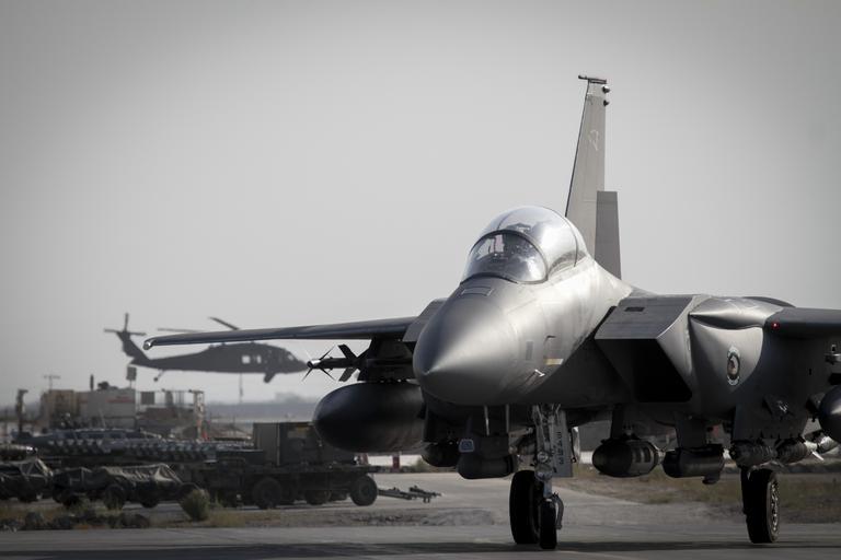 Keywords: u.s. air force usairforce u.s. army usarmy rc east rceast rce oef operation enduring freedom operationenduringfreedom afghanistan bagram baf usaf air force airforce cas close air support closeairsupport military photo f-15e f15e strike eagle strikeeagle airman airmen maintenance army 335th fighter squadron fightersquadron 335th fighter squadron 335thfightersquadron strike eagle fighter squadron operation enduring freedom f-15 f15 afterburner take off airplane aircraft combat close air support aviation conflict pilot pilots weapons bombs creative commons royalty free public domain photograph digital matt hecht getty reuters ap vehicle outdoor A U.S. Air Force F-15E Strike Eagle from the 335th Expeditionary Fighter Squadron taxis while a U.S. Army Black Hawk helicopter takes off from Bgram Air Field on Sept. 30, 2011. (U.S. Air National Guard photo by Tech. Sgt. Matt Hecht/Released) A U.S. Air Force F-15E Strike Eagle from the 335th Expeditionary Fighter Squadron taxis while a U.S. Army Black Hawk helicopter takes off from Bgram Air Field on Sept. 30, 2011. (U.S. Air National Guard photo by Tech. Sgt. Matt Hecht/Released)