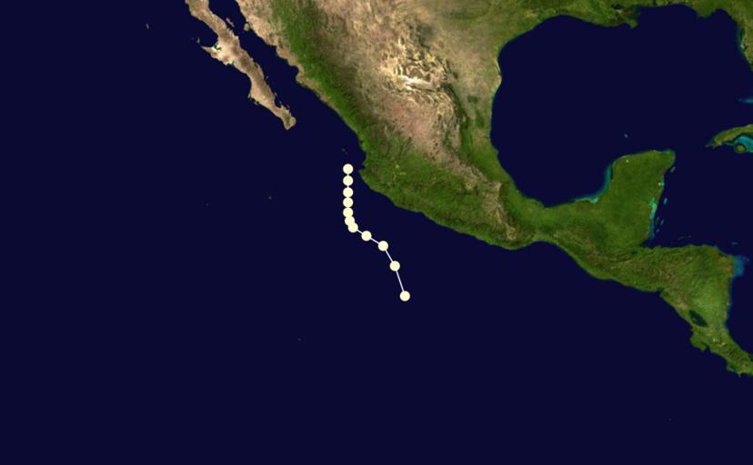 Keywords: 11-E 1957 track.png Track map of Hurricane Eleven of the 1957 Pacific hurricane season The points show the location of the storm at 6-hour intervals The colour represents the storm's maximum sustained wind speeds as classified in the Saffir-Simpson Hurricane Scale see below and the shape of the data points represent the nature of the storm according to the legend below User Nilfanion/Tc/T Created by Cyclonebiskit using Wikipedia WikiProject Tropical cyclones/Tracks The background image is from NASA Tracking data switch source from the National Hurricane Center <sup>http //www nhc noaa gov/pastall shtml</sup> from the Central Pacific Hurricane Center <sup>http //www prh noaa gov/cphc/summaries/</sup> from the Joint Typhoon Warning Center <sup>https //metocph nmci navy mil/jtwc/best_tracks/</sup> from the Japan Meteorological Agency <sup>http //www jma go jp/jma/jma-eng/jma-center/rsmc-hp-pub-eg/besttrack html</sup> from the National Hurricane Center <sup>http //www nhc noaa gov/pastall shtml and the Central Pacific Hurricane Center http //www prh noaa gov/cphc/summaries/</sup> from the Central Pacific Hurricane Center <sup>http //www prh noaa gov/cphc/summaries/ and the Joint Typhoon Warning Center https //metocph nmci navy mil/jtwc/best_tracks/</sup> from the w National Hurricane Center <sup>http //www nhc noaa gov/pastall shtml</sup> or the Joint Typhoon Warning Center <sup>https //metocph nmci navy mil/jtwc/best_tracks/</sup> 2010-01-10 Cyclonebiskit Tropical cyclone tracks Pacific hurricane tracks |