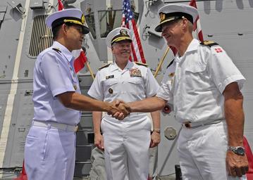 Keywords: 1200329-N-AZ513 Rear Adm. Tanin Likitawong, left, relieves Royal Danish Navy Commodore Aage Buur Jensen.jpg MUSCAT Oman March 29 2012 Royal Thai Navy Rear Adm Tanin Likitawong left relieves Royal Danish Navy Commodore Aage Buur Jensen right of command during a change of command ceremony for Combined Task Force CTF 151 as U S Navy Vice Adm Mark Fox commander of Combined Maritime Forces looks on Established in January 2009 CTF 151 was set up to deter disrupt and suppress piracy protecting maritime vessels of any nationality international trade and securing freedom of navigation for the benefit of all U S Navy photo by Mass Communication Specialist 3rd Class John Callahan/Released 2012-03-29 12 18 Mass Communication Specialist 3rd Class John Callahan https //www flickr com/photos/compacflt/6882070116/ PD-USGov-Military-Navy 1200329-N-AZ513 MUSCAT Oman PD-USGov-Military-Navy Admirals of Denmark Admirals of Thailand Mark I Fox Combined Task Force 151 |