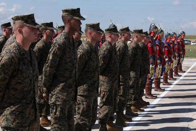 MAKE A MEME View Large Image 120812-M-XK110-378 (7783066686).jpg U S Marines stand in formation next to the Mongolian Armed Forces band during the opening ceremony for Khaan Quest 2012 at the Mongolian Armed Forces Peace Support Center near Ulaanbaatar Mongolia Aug 12 ...