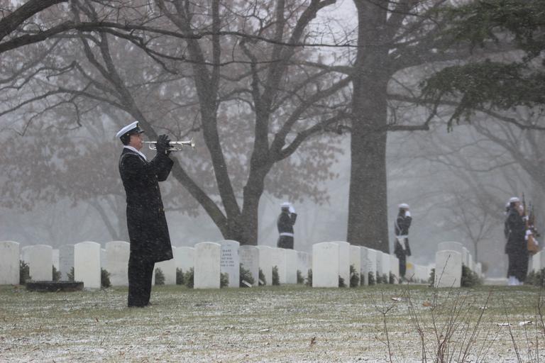 | Keywords: outdoor 140121-N-ZE053-004 ARLINGTON, Va. (Jan. 21, 2014) Chief Musician Stan Curtis plays taps during a full honors funeral at Arlington National Cemetery. A snow storm closed the federal government that day, however the Navy Band and the Ceremonial Guard continued to render honors to veterans. The band performs music at official military, government and special events. (U.S. Navy photo by Chief Musician Christian Johanson/Released) 140121-N-ZE053-004 ARLINGTON, Va. (Jan. 21, 2014) Chief Musician Stan Curtis plays taps during a full honors funeral at Arlington National Cemetery. A snow storm closed the federal government that day, however the Navy Band and the Ceremonial Guard continued to render honors to veterans. The band performs music at official military, government and special events. (U.S. Navy photo by Chief Musician Christian Johanson/Released) |