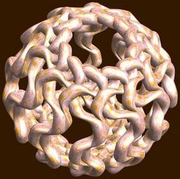 | Keywords: mathematica 3d cg parametricplot3d texture torus 輪環 りんかん ドーナツ どーなつ 八芒星 はちぼうせい 八光星 はちこうせい 八稜星 はちりょうせい code program algorithm コード プログラム アルゴリズム geometric sculpture geometricsculpture shape geometry sculpture mapping テクスチャ マッピング 模様 もよう abstract 抽象 ちゅうしょう アブストラクト design pattern デザイン パターン graphic グラフィック グラフィクス structure 意匠 構造 symmetry 対称性 たいしょうせい シンメトリー 対称 たいしょう algorithm コード black background indoor food a = 12; (* center hole size of a torus *) b = 8; (* octa-torus *) c = -18; (* distance from the center of rotation *) d = 12; (* number of torus *) h = 1; (* height of a torus *) SetOptions[ParametricPlot3D, PlotRange -> Full, Mesh -> None, Boxed -> False, Axes -> False, PlotPoints -> 400, ImageSize -> 3000, Background -> Darker[Orange, 0.8], PlotStyle -> Directive[Specularity[White, 30], Texture[Import["D:/tmp/861.jpg"]]], TextureCoordinateFunction -> ({#4, #5 2 Pi} &), Lighting -> "Neutral"]; f[v_] := Sin[2 Sin[Sin[Sin[v]]]]; x = (a - Cos[t] - f[b s]) Cos[s + Pi/b]; y = (a - Cos[t] - f[b s]) Sin[s + Pi/b]; z = (a - Sin[t] - h f[b s]) + c; rm = Table[{x, y, z}.RotationMatrix[2 i Pi/d, {1, 1, 0}], {i, d}]; ParametricPlot3D[rm, {t, 0, 2 Pi}, {s, 0, 2 Pi}] (*--- The Texture *) a = 12; (* center hole size of a torus *) b = 8; (* octa-torus *) c = -18; (* distance from the center of rotation *) d = 12; (* number of torus *) h = 1; (* height of a torus *) SetOptions[ParametricPlot3D, PlotRange -> Full, Mesh -> None, Boxed -> False, Axes -> False, PlotPoints -> 400, ImageSize -> 3000, Background -> Darker[Orange, 0.8], PlotStyle -> Directive[Specularity[White, 30], Texture[Import["D:/tmp/861.jpg"]]], TextureCoordinateFunction -> ({#4, #5 2 Pi} &), Lighting -> "Neutral"]; f[v_] := Sin[2 Sin[Sin[Sin[v]]]]; x = (a - Cos[t] - f[b s]) Cos[s + Pi/b]; y = (a - Cos[t] - f[b s]) Sin[s + Pi/b]; z = (a - Sin[t] - h f[b s]) + c; rm = Table[{x, y, z}.RotationMatrix[2 i Pi/d, {1, 1, 0}], {i, d}]; ParametricPlot3D[rm, {t, 0, 2 Pi}, {s, 0, 2 Pi}] (*--- The Texture *) |