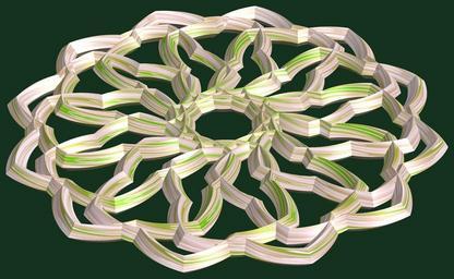 | Keywords: mathematica 3d cg parametricplot3d texture torus code program algorithm プログラム コード アルゴリズム 輪環 りんかん ドーナツ どーなつ 五芒星 ごぼうせい geometric sculpture geometricsculpture shape geometry sculpture mapping テクスチャ マッピング 模様 もよう abstract 抽象 ちゅうしょう アブストラクト design pattern デザイン パターン graphic グラフィック グラフィクス structure 意匠 構造 symmetry 対称性 たいしょうせい シンメトリー 対称 たいしょう black background tangle a = 8; (* center hole size *) b = 5; (* penta-torus *) c = 8; (* distance from the center of rotation *) d = 12; (* number of torus *) h = 0; (* height of a torus *) SetOptions[ParametricPlot3D, PlotRange -> Full, Mesh -> None, Boxed -> False, Axes -> False, PlotPoints -> 400, ImageSize -> 3000, Background -> RGBColor[{20, 50, 30}/255], PlotStyle -> Directive[Specularity[White, 70], Texture[Import["D:/tmp/862.jpg"]]], TextureCoordinateFunction -> ({#4 + #5, #5 / Pi} &), Lighting -> "Neutral"]; f[v_] := TriangleWave[{-1, 1}, v/(2 Pi)]; g[v_] := TriangleWave[{-1, 1}, v/(2 Pi) + 1/4]; x = (a - g[t] - f[b s]) Cos[s] + c; y = (a - g[t] - f[b s]) Sin[s] + c; z = (a - f[t] - h f[b s]); rm = Table[{x, y, z}.RotationMatrix[2 i Pi/d, {0, 0, 1}], {i, d}]; ParametricPlot3D[rm, {t, 0, 2 Pi}, {s, 0, Pi}] (*--- The Texture *) a = 8; (* center hole size *) b = 5; (* penta-torus *) c = 8; (* distance from the center of rotation *) d = 12; (* number of torus *) h = 0; (* height of a torus *) SetOptions[ParametricPlot3D, PlotRange -> Full, Mesh -> None, Boxed -> False, Axes -> False, PlotPoints -> 400, ImageSize -> 3000, Background -> RGBColor[{20, 50, 30}/255], PlotStyle -> Directive[Specularity[White, 70], Texture[Import["D:/tmp/862.jpg"]]], TextureCoordinateFunction -> ({#4 + #5, #5 / Pi} &), Lighting -> "Neutral"]; f[v_] := TriangleWave[{-1, 1}, v/(2 Pi)]; g[v_] := TriangleWave[{-1, 1}, v/(2 Pi) + 1/4]; x = (a - g[t] - f[b s]) Cos[s] + c; y = (a - g[t] - f[b s]) Sin[s] + c; z = (a - f[t] - h f[b s]); rm = Table[{x, y, z}.RotationMatrix[2 i Pi/d, {0, 0, 1}], {i, d}]; ParametricPlot3D[rm, {t, 0, 2 Pi}, {s, 0, Pi}] (*--- The Texture *) |