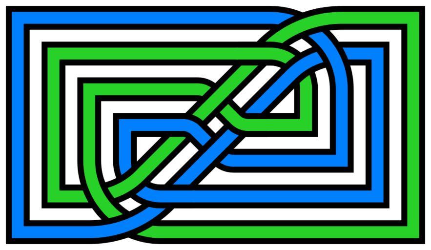 Keywords: 12crossing-link-inrectangle.svg A 12-crossing ornamental link of mathematical knot theory consisting of two interlaced trefoil knots in non-3-fold-symmetric form see File Trefoil-non-3-symm svg fitted closely inside a rectangle Self-made image converted from the following vector PostScript source code <pre> 306 396 translate/x 31250 sqrt def /A x 100 add -150 moveto x 100 add 150 lineto x 0 150 90 135 arc x neg 0 100 315 270 arcn x neg 50 sub -100 lineto x neg 50 sub 100 lineto x 100 sub 50 50 90 0 arcn x 50 sub 0 lineto 1250 sqrt 10 355339 add 25 25 270 225 arcn 1250 sqrt neg 10 355339 add 25 25 45 90 arc x neg 50 lineto x neg -50 lineto x 100 sub neg -50 100 180 270 arc closepath gsave 0 setgray 100 3 div setlinewidth stroke grestore 100 6 div setlinewidth stroke def gsave 16 82 16 setrgbcolor A 180 rotate 0 5 1 setrgbcolor A grestore 0 setgray 100 3 div setlinewidth x 0 150 100 124 7 arc stroke x neg 0 100 297 315 arc 6 6 rlineto stroke 73 0 moveto 1250 sqrt 10 355339 add 25 25 270 225 arcn -5 5 rlineto stroke /B x 100 sub 50 50 72 90 arc -45 0 rlineto stroke 212 132 3 div 318 198 3 div moveto -60 -60 rmoveto -22 -22 rlineto stroke x 100 sub neg -50 100 198 222 arc stroke def gsave B 180 rotate B grestore 16 82 16 setrgbcolor 100 6 div setlinewidth x 0 150 98 5 125 8 arc stroke x neg 0 100 295 317 arc 6 6 rlineto stroke 76 0 moveto 1250 sqrt 10 355339 add 25 25 270 225 arcn -7 7 rlineto stroke /C x 100 sub 50 50 69 90 arc -48 0 rlineto stroke 212 132 3 div 318 198 3 div moveto -58 -58 rmoveto -26 -26 rlineto stroke x 100 sub neg -50 100 195 225 arc stroke def gsave 16 82 16 setrgbcolor C 180 rotate 0 5 1 setrgbcolor C grestore showpage EOF</pre> 2012 AnonMoos thumb center basic unit thumb center two of this joined For a completely different version of two mutually-interlaced trefoil knots see File Two-interlaced-trefoil-knots-30crossings svg <gallery>File Two-interlaced-trefoil-knots-30crossings svg</gallery> 2 component links 12 crossing number knots and links Decorative knots Images with PostScript source code Outline knots and links 2-fold rotational symmetry