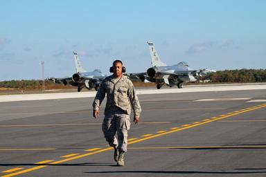 | Keywords: u.s. air force usairforce usaf national guard nationalguard new jersey air national guard newjerseyairnationalguard new jersey newjersey nj ac acc air combat command aircombatcommand air force airforce air national guard airnationalguard atlantic city atlanticcity f-16 f16 f-16c f16c fighting falcon fightingfalcon viper fighter' aircraft fighteraircraft airplane military jersey devils jerseydevils pilot airmen airman weapons armament systems armamentsystems egg harbor township eggharbortownship united states of america unitedstatesofamerica creative commons royalty free public domain photo photograph digital matt hecht getty reuters ap public domain publicdomain royalty free royaltyfree aircraft aviation combat iraq afghanistan war operation enduring freedom operationenduringfreedom operation iraqi freedom operationiraqifreedom strike eagle strikeeagle sunrise sunset air force one airforceone red flag alaska redflagalaska green flag east combat eastcombat aviation pilot pilots military aviationpilotpilotsmilitary helicopter helo rotary wing fixed wing fixedwing jet fighter plane outdoor U.S. Air Force Senior Airman Maurice Poole walks back to his vehicle after doing some "last chance" training munitions checks as F-16C Fighting Falcons from the New Jersey Air National Guard's 177th Fighter Wing prepare for takeoff behind him at Atlantic City Air National Guard Base, N.J. on Oct. 18. Poole is an aircraft armament systems specialist assigned to the 177th Maintenance Squadron. (U.S. Air National Guard photo by Tech. Sgt. Matt Hecht/Released) U.S. Air Force Senior Airman Maurice Poole walks back to his vehicle after doing some "last chance" training munitions checks as F-16C Fighting Falcons from the New Jersey Air National Guard's 177th Fighter Wing prepare for takeoff behind him at Atlantic City Air National Guard Base, N.J. on Oct. 18. Poole is an aircraft armament systems specialist assigned to the 177th Maintenance Squadron. (U.S. Air National Guard photo by Tech. Sgt. Matt Hecht/Released) |