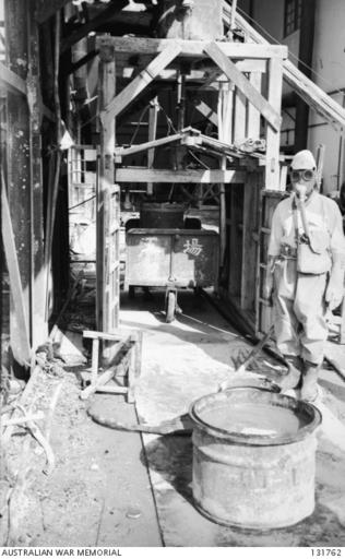Keywords: 131762 FILLING HOOD AT "C" STORAGE, AT THE FORMER TOKYO 2ND ARMY ARSENAL.JPG en OKUNOSHIMA JAPAN FILLING HOOD AT C STORAGE AT THE FORMER TOKYO 2ND ARMY ARSENAL NOTE THE GAS CONTAINER ON A SMALL TROLLEY READY FOR FILLING WHEN HOOD IS IN USE DOORS ARE CLOSED AND AIR EXHAUST SYSTEM PUT INTO OPERATION TO DRAW OFF POISONOUS FUMES IN DRUM IN FOREGROUND IS BLEACH SLURRY HYPERCLORITE - 50/50 BY WEIGHT WITH SEA WATER USED FOR THE DECONTAMINATION OF WORKMEN'S RUBBER CLOTHING AND FILLED CONTAINERS THIS IS PART OF OPERATION LEWISITE TO REMOVE AND DESTROY POISON GAS MAINLY MUSTARD AND LEWISITE FROM THE TOKYO 2ND ARMY ARSENAL 131762 Queale Alan 1946-08-30 Copyright expired - public domain PD-AustraliaGov Chemical weapons in Okunoshima 1946-1947 |