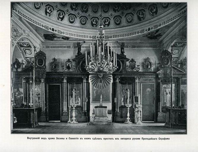 View Original:13. Внутренний вид храма Зосимы и Савватия Соловецких, в коем сделан престол их кипариса руками преподобного Серафима.jpg (1042x800)