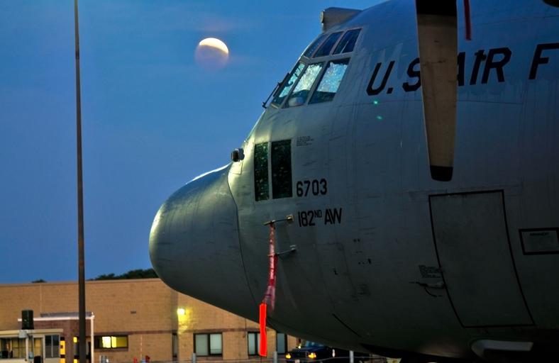 Keywords: air force usaf 182 aw 182nd airlift wing peoria illinois ill ang national guard il angb ngb mobility command amc c-130 c130 hercules lunar eclipse celestial event moon shadow usa outdoor A C-130 Hercules rests under a lunar eclipse at the 182nd Airlift Wing in Peoria, Ill., Oct. 8, 2014. The celestial event happened when the moon moved into Earth’s shadow. (U.S. Air National Guard photo by Staff Sgt. Lealan Buehrer/Released) A C-130 Hercules rests under a lunar eclipse at the 182nd Airlift Wing in Peoria, Ill., Oct. 8, 2014. The celestial event happened when the moon moved into Earth’s shadow. (U.S. Air National Guard photo by Staff Sgt. Lealan Buehrer/Released)