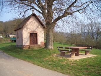 | Keywords: 14-Hl-Kapelle Gamburg.JPG de Gamburg Lindhelle; die 14-Heiligen-Kapelle mit Sitzgruppe davor Diese kleine Kapelle ist im Jahre 1823 von Michael und Elisabetha Hauck gestiftet worden und stand 100 Jahre lang unten im Tal an der alten Landstraße Beim Neubau der Steige wurde die Kapelle an den heutigen Standort verlegt neben den Wanderweg zur Bauernwaldhütte und nach Bronnbach own Hokemo TV 2013-04 Cc-zero Gamburg Werbach | ||||