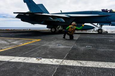 | Keywords: john c. stennis johncstennis cvn74 aircraft carrier aircraftcarrier mc3 ignacio d. perez mc3ignaciodperez pacific ocean pacificocean outdoor 150413-N-TC437-002 PACIFIC OCEAN (April 13, 2015) - Aviation Boatswain's Mate (Equipment) 2nd Class Chord Deckert, from Hemet, Calif., gives the signal for an F/A-18E Super Hornet from the Warhawks of Strike Fighter Squadron (VFA) 97 to launch from USS John C. Stennis' flight deck. Stennis (CVN 74) is undergoing Tailored Ship's Training Availability and Final Evolution Problem, assessing its abilities to conduct combat missions, support functions and survive complex casualty control situations. (U.S. Navy Photo by Mass Communication Specialist 3rd Class Ignacio D. Perez/ Released) 150413-N-TC437-002 PACIFIC OCEAN (April 13, 2015) - Aviation Boatswain's Mate (Equipment) 2nd Class Chord Deckert, from Hemet, Calif., gives the signal for an F/A-18E Super Hornet from the Warhawks of Strike Fighter Squadron (VFA) 97 to launch from USS John C. Stennis' flight deck. Stennis (CVN 74) is undergoing Tailored Ship's Training Availability and Final Evolution Problem, assessing its abilities to conduct combat missions, support functions and survive complex casualty control situations. (U.S. Navy Photo by Mass Communication Specialist 3rd Class Ignacio D. Perez/ Released) |