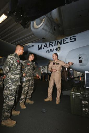 Keywords: camp h.m.smith camphmsmith hawaii usa U.S. Marine Corps Capt. Kristopher Hurtley, MV-22 Osprey pilot, with Marine Medium Tiltrotor Squadron 161, explains the capabilities of Osprey's to Republic of Korea Marines aboard the USS Essex, at sea, May 19, 2015. Senior military leaders of allies and partners visited Hawaii to participate in the U.S. Pacific Command Amphibious Leaders Symposium. (U.S. Marine Corps photo by Lance Cpl. Lance Cpl. Wesley Timm/Released) U.S. Marine Corps Capt. Kristopher Hurtley, MV-22 Osprey pilot, with Marine Medium Tiltrotor Squadron 161, explains the capabilities of Osprey's to Republic of Korea Marines aboard the USS Essex, at sea, May 19, 2015. Senior military leaders of allies and partners visited Hawaii to participate in the U.S. Pacific Command Amphibious Leaders Symposium. (U.S. Marine Corps photo by Lance Cpl. Lance Cpl. Wesley Timm/Released)