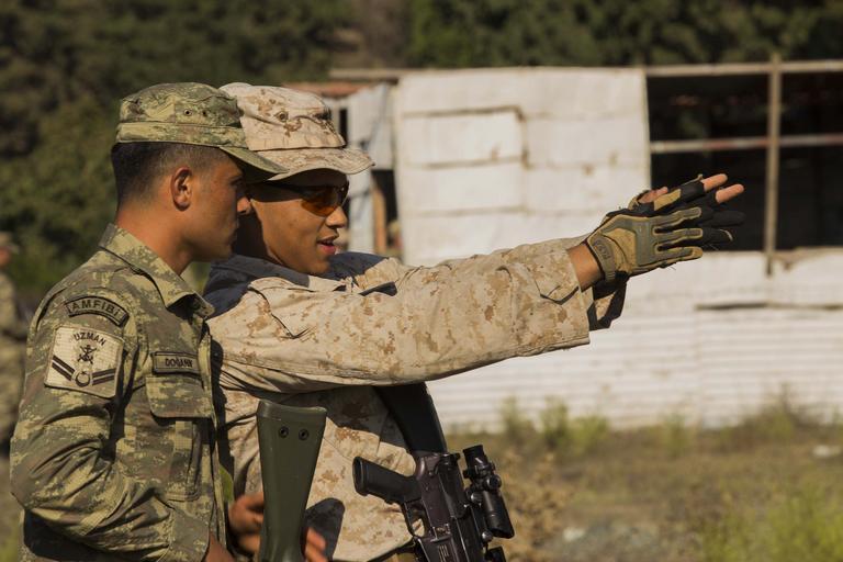| Keywords: comcam usmc uss keasarge usskeasarge 26th meu 26thmeu egemen 2015 egemen2015 turkey dogenbey people outdoor 151025-M-ED118-300 DOGANBEY, Turkey (Oct. 25, 2015) U.S. Marine Corps Lance Cpl. Brandy Acosta, fire-team leader, assigned to Golf Company, Battalion Landing Team 2/6, 26th Marine Expeditionary Unit , and a Turkish Marine discuss lanes of fire during Exercise Egemen 2015 in Doganbey, Turkey Oct. 25. Egemen is a Turkish-led and hosted amphibious exercise designed to increase tactical proficiencies and interoperability among participants. The 26th Marine Expeditionary Unit is deployed to the 6th fleet area of responsibility in support of U.S. national security interests in Europe. (U.S. Marine Corps photo by Cpl. Jalen D. Phillips/ Released) 151025-M-ED118-300 DOGANBEY, Turkey (Oct. 25, 2015) U.S. Marine Corps Lance Cpl. Brandy Acosta, fire-team leader, assigned to Golf Company, Battalion Landing Team 2/6, 26th Marine Expeditionary Unit , and a Turkish Marine discuss lanes of fire during Exercise Egemen 2015 in Doganbey, Turkey Oct. 25. Egemen is a Turkish-led and hosted amphibious exercise designed to increase tactical proficiencies and interoperability among participants. The 26th Marine Expeditionary Unit is deployed to the 6th fleet area of responsibility in support of U.S. national security interests in Europe. (U.S. Marine Corps photo by Cpl. Jalen D. Phillips/ Released) |