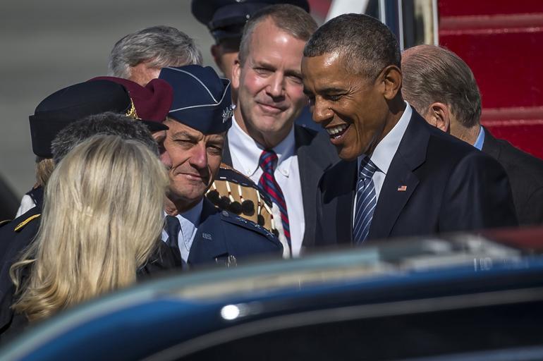 MAKE A MEME View Large Image President Barack Obama speaks with Joint Base Elmendorf-Richardson military leaders, and Alaska government officials after disembarking Air Force One at JBER, Alaska, Monday, Aug. 31, 2015. President Obama was the main speaker at a major ...