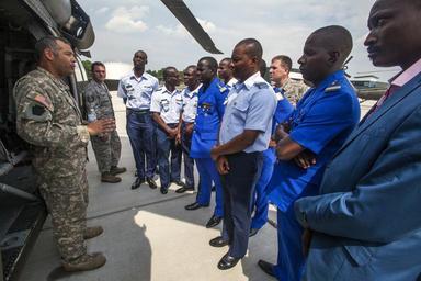 | Keywords: african air forces africanairforces african partnership flight africanpartnershipflight africom tour visit conference army aviation support facility armyaviationsupportfacility aasf uh-60a black hawk uh60ablackhawk black hawk blackhawk uh-60a uh60a uh-60 uh60 helicopter helicopters 1-150th assault helicopter battalion 1150thassaulthelicopterbattalion 1-150 ahb 1150ahb new jersey army national guard newjerseyarmynationalguard njarng new jersey national guard newjerseynationalguard njng army national guard armynationalguard arng soldier soldiers aviator aviators crew chief crewchief national guard nationalguard ng u.s. air forces in europe usairforcesineurope usafe u.s. air forces africa usairforcesafrica usafa maintenance logistics knowledge procedures regional military to military events regionalmilitarytomilitaryevents aviation capacity aviationcapacity enhance regional cooperation enhanceregionalcooperation cooperation increase interoperability increaseinteroperability interoperability africa angola burkina faso burkinafaso ghana mali niger nigeria senegal tunisia military united states air force unitedstatesairforce usaf air force airforce af joint base mcguire-dix-lakehurst jointbasemcguiredixlakehurst jbmdl n.j. nj new jersey newjersey aug. 31 2015 aug312015 photo by master sgt. mark c. olsen photobymastersgtmarkcolsen u.s. us outdoor Staff Sgt. Simon Debran, left, UH-60A Black Hawk crew chief, briefs visiting African air force members as they prepare to board a Black Hawk helicopter with the 1-150th Assault Helicopter Battalion, New Jersey Army National Guard, during their visit to Joint Base McGuire-Dix-Lakehurst, N.J., Aug. 31, 2015. The African Partnership Flight, which includes military representatives from Angola, Burkina Faso, Ghana, Mali, Niger, Nigeria, Senegal and Tunisia, visit to the NJARNG’s Army Aviation Support Facility is part of U.S. Air Forces in Europe and U.S. Air Forces Africa program that emphasized increased maintenance and logistics knowledge and procedures. The program was created to conduct regional military to military events with African air forces to build aviation capacity, enhance regional cooperation and increase interoperability. (U.S. Air National Guard photo by Master Sgt. Mark C. Olsen/Released) Staff Sgt. Simon Debran, left, UH-60A Black Hawk crew chief, briefs visiting African air force members as they prepare to board a Black Hawk helicopter with the 1-150th Assault Helicopter Battalion, New Jersey Army National Guard, during their visit to Joint Base McGuire-Dix-Lakehurst, N.J., Aug. 31, 2015. The African Partnership Flight, which includes military representatives from Angola, Burkina Faso, Ghana, Mali, Niger, Nigeria, Senegal and Tunisia, visit to the NJARNG’s Army Aviation Support Facility is part of U.S. Air Forces in Europe and U.S. Air Forces Africa program that emphasized increased maintenance and logistics knowledge and procedures. The program was created to conduct regional military to military events with African air forces to build aviation capacity, enhance regional cooperation and increase interoperability. (U.S. Air National Guard photo by Master Sgt. Mark C. Olsen/Released) |