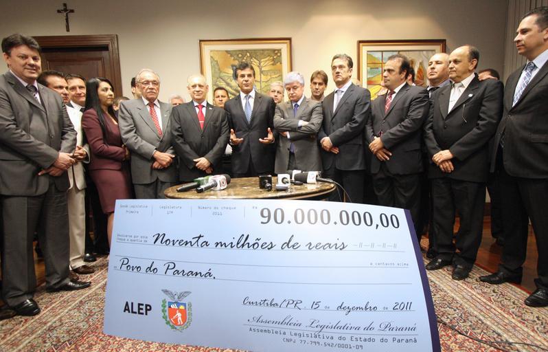 | Keywords: devolução cheque simbólico chequesimbólico 90 milhões 90milhões economia alep legislativo paranaense legislativoparanaense nelson luersen nelsonluersen cantora mara lima cantoramaralima duílio genari duíliogenari ademar traiano ademartraiano beto richa betoricha douglas fabrício douglasfabrício valdir rossoni valdirrossoni plauto miró plautomiró paranhos reni pereira renipereira dr batista drbatista pedro lupion pedrolupion gilson de souza gilsondesouza mauro moraes mauromoraes people A Assembleia Legislativa devolveu ao Governo do Estado R$ 90 milhões, resultado das economias pelas medidas moralizadoras e saneadoras implantadas no primeiro ano de gestão da atual Mesa Executiva. O valor foi entregue ao governador Beto Richa (PSDB) no início da tarde desta quinta-feira (15), em ato simbólico realizado na Presidência do Poder Legislativo, na presença de diversos deputados, diretores, além de secretários de Estado. Leia mais: www.alep.pr.gov.br/imprensa/noticias/noticia/20847/assemb... Foto: Nani Gois/Alep (crédito obrigatório) A Assembleia Legislativa devolveu ao Governo do Estado R$ 90 milhões, resultado das economias pelas medidas moralizadoras e saneadoras implantadas no primeiro ano de gestão da atual Mesa Executiva. O valor foi entregue ao governador Beto Richa (PSDB) no início da tarde desta quinta-feira (15), em ato simbólico realizado na Presidência do Poder Legislativo, na presença de diversos deputados, diretores, além de secretários de Estado. Leia mais: www.alep.pr.gov.br/imprensa/noticias/noticia/20847/assemb... Foto: Nani Gois/Alep (crédito obrigatório) |