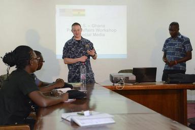 Keywords: indoor 160122-N-UE250-030 ACCRA, Ghana (Jan. 21, 2016) Lt. Adam Cole, center, assigned to U.S. Naval Forces Europe-Africa/U.S. 6th Fleet answers questions about the U.S. Navy’s policy on public affairs, while in Accra, Ghana, Jan. 21, 2016. Cole was in Accra to coordinate a Public Affairs Workshop designed to allow service members from each nation to share ideas and standard operating practices of the public affairs mission. The event was part of Africa Partnership Station, an international collaborative capacity-building program, with various nations working alongside African partners to enhance maritime security. (U.S. Navy photo by Mass Communication Specialist 2nd Class Corey Hensley/Released) 160122-N-UE250-030 ACCRA, Ghana (Jan. 21, 2016) Lt. Adam Cole, center, assigned to U.S. Naval Forces Europe-Africa/U.S. 6th Fleet answers questions about the U.S. Navy’s policy on public affairs, while in Accra, Ghana, Jan. 21, 2016. Cole was in Accra to coordinate a Public Affairs Workshop designed to allow service members from each nation to share ideas and standard operating practices of the public affairs mission. The event was part of Africa Partnership Station, an international collaborative capacity-building program, with various nations working alongside African partners to enhance maritime security. (U.S. Navy photo by Mass Communication Specialist 2nd Class Corey Hensley/Released) |