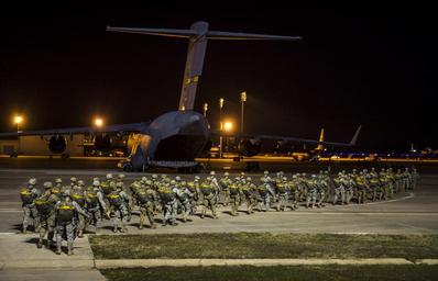 Keywords: joax large package week largepackageweek soldiers mobility cargo airmen pope army airfield popearmyairfield north carolina northcarolina usa outdoor U.S. Army Soldiers with the 1st Battalion, 504th Parachute Infantry Regiment, 1st Brigade Combat Team, 82nd Airborne Division, make their way to their aircraft for a night static-line jump on Sicily Drop Zone during Large Package Week at Pope Army Airfield, N.C., Feb. 7, 2016. Large Package Week leads up to Joint Operational Access Exercise 16-5, where in Army and Air Force units work together to improve interoperability for worldwide crisis, contingency and humanitarian operations. (U.S. Air Force photo by Staff Sgt. Marianique Santos) U.S. Army Soldiers with the 1st Battalion, 504th Parachute Infantry Regiment, 1st Brigade Combat Team, 82nd Airborne Division, make their way to their aircraft for a night static-line jump on Sicily Drop Zone during Large Package Week at Pope Army Airfield, N.C., Feb. 7, 2016. Large Package Week leads up to Joint Operational Access Exercise 16-5, where in Army and Air Force units work together to improve interoperability for worldwide crisis, contingency and humanitarian operations. (U.S. Air Force photo by Staff Sgt. Marianique Santos)
