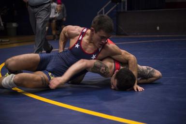 | Keywords: navy region northwest navyregionnorthwest nrnw cnrnw pacific northwest pacificnorthwest nbk kitsap county kitsapcounty greco-roman grecoroman freestyle all-navy sports allnavysports armed forces sports armedforcessports bremerton washington united states unitedstates us sport 160221-N-OO032-595 BREMERTON, Wash. (Feb 21, 2016) - Fireman Ryan Schmehr, a San Diego native stationed with USS Ronald Reagan (CVN 76), scrambles for position against Air Force Airman 1st Class Joey Garza in a 57kg Freestyle wrestling match during the 2016 Armed Forces Championship at Naval Base Kitsap-Bremerton. The tournament is held over two days, one for Greco-Roman style wrestling and the other Freestyle, between the Army, Navy, Marine Corps and Air Force. (U.S. Navy photo by Mass Communication Specialist 2nd Class Cory Asato/Released) 160221-N-OO032-595 BREMERTON, Wash. (Feb 21, 2016) - Fireman Ryan Schmehr, a San Diego native stationed with USS Ronald Reagan (CVN 76), scrambles for position against Air Force Airman 1st Class Joey Garza in a 57kg Freestyle wrestling match during the 2016 Armed Forces Championship at Naval Base Kitsap-Bremerton. The tournament is held over two days, one for Greco-Roman style wrestling and the other Freestyle, between the Army, Navy, Marine Corps and Air Force. (U.S. Navy photo by Mass Communication Specialist 2nd Class Cory Asato/Released) |