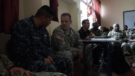 | Keywords: 160315-A-VY429-005 DOUALA, Cameroon (March 15, 2016) Staff Sgt. Tony Miller translates a Maritime Operations class to Hospital Corpsman 1st Class Hugo Sanchezolmos during Exercise Obangame/Saharan Express 2016 (OESE16) March 15, 2016. OESE16 is a U.S. combined U.S. Africa Command-sponsored multinational maritime exercise designed to increase maritime safety and security in the Gulf of Guinea. (U.S. Army photo by Staff Sgt. Lea Anne Cuatt/Released 160315-A-VY429-005 DOUALA, Cameroon (March 15, 2016) Staff Sgt. Tony Miller translates a Maritime Operations class to Hospital Corpsman 1st Class Hugo Sanchezolmos during Exercise Obangame/Saharan Express 2016 (OESE16) March 15, 2016. OESE16 is a U.S. combined U.S. Africa Command-sponsored multinational maritime exercise designed to increase maritime safety and security in the Gulf of Guinea. (U.S. Army photo by Staff Sgt. Lea Anne Cuatt/Released |