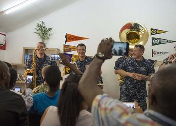 Keywords: africa partnership station 2016; aps16; aps; c6f; usns; spearhea africapartnershipstation2016aps16apsc6fusnsspearhea libreville, gabon librevillegabon africa partnership station 2016; aps16; aps; c6f; usns; spearhead; navy; partnership; military sealift command; u.s. navy; navy; africapartnershipstation2016aps16apsc6fusnsspearheadnavypartnershipmilitarysealiftcommandusnavynavy 160413-N-QF605-265 LIBREVILLE, Gabon (April 13, 2016) - Gabon locals take photos of the U.S. Naval Forces Europe Band “Topside” as they perform at American Corner in Libreville, Gabon, April 13, 2016. American Corner is an American cultural center that aims to promote U.S. culture in Gabon. (U.S. Navy photo by Mass Communication Specialist 1st Class Amanda Dunford/Released) 160413-N-QF605-265 LIBREVILLE, Gabon (April 13, 2016) - Gabon locals take photos of the U.S. Naval Forces Europe Band “Topside” as they perform at American Corner in Libreville, Gabon, April 13, 2016. American Corner is an American cultural center that aims to promote U.S. culture in Gabon. (U.S. Navy photo by Mass Communication Specialist 1st Class Amanda Dunford/Released) |