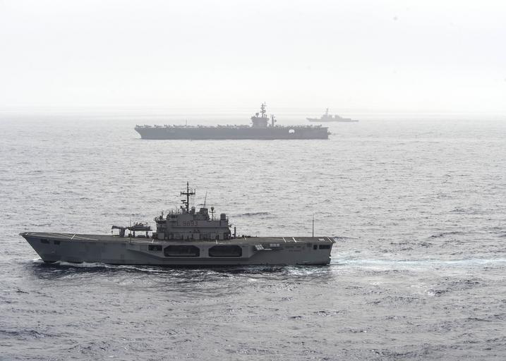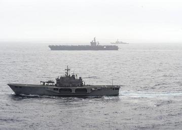 Keywords: ike csg ikecsg uss dwight d. eisenhower ussdwightdeisenhower green fleet greenfleet outdoor boat vehicle 160616-N-QY430-007 MEDITERRANEAN SEA (June 16, 2016) – The guided-missile destroyer USS Roosevelt (DDG 80), top, guided-missile cruiser USS San Jacinto (CG 56), middle, and Itialian navy participate in the Flotta Verde exercise as part of the Great Green Fleet initiative. The Eisenhower Carrier Strike Group is conducting naval operations in the U.S. 6th Fleet area of operations in support of U.S. national security interests in Europe. (U.S. Navy photo by Mass Communication Specialist 1st Class Rafael Martie/Released) 160616-N-QY430-007 MEDITERRANEAN SEA (June 16, 2016) – The guided-missile destroyer USS Roosevelt (DDG 80), top, guided-missile cruiser USS San Jacinto (CG 56), middle, and Itialian navy participate in the Flotta Verde exercise as part of the Great Green Fleet initiative. The Eisenhower Carrier Strike Group is conducting naval operations in the U.S. 6th Fleet area of operations in support of U.S. national security interests in Europe. (U.S. Navy photo by Mass Communication Specialist 1st Class Rafael Martie/Released) |