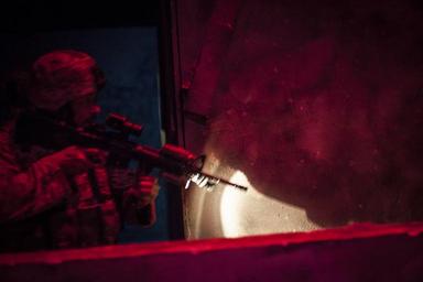 Keywords: U.S. Air Force Tech. Sgt. David Pabon moves tactically through an indoor Military Operations in Urban Terrain (MOUT) site at the New Jersey National Guard's Joint Training & Training Development Center (JT2DC), Joint Base McGuire-Dix-Lakehurst, N.J., June 16, 2016. Pabon is a Security Forces specialist assigned to the New Jersey Air National Guard's 177th Security Forces Squadron. The 177th Security Forces Squadron was utilizing the ability for the JT2DC's training areas to simulate low-light conditions in an urban environment. The red and blue lighting simulates a moonlit night as seen through night vision devices. (U.S. Air National Guard photo by Tech. Sgt. Matt Hecht/Released) usaf usairforce airnationalguard newjersey 177thsecurityforcessquadron m4 training jointbasemcguiredixlakehurst jt2dc nj usa publicdomain free |