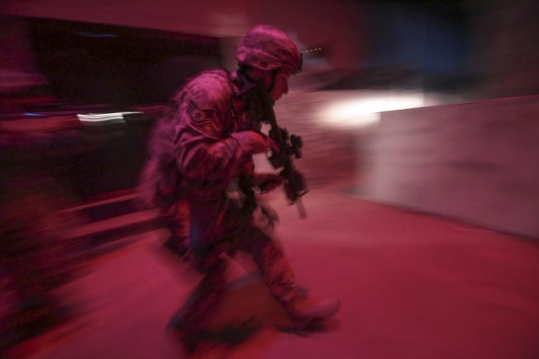 Keywords: usaf u.s. air force usairforce air national guard airnationalguard new jersey newjersey 177th security forces squadron 177thsecurityforcessquadron m4 training joint base mcguire-dix-lakehurst jointbasemcguiredixlakehurst jt2dc n.j. nj usa public domain publicdomain free U.S. Air Force Staff Sgt. Christopher Raine maneuvers through an indoor Military Operations in Urban Terrain (MOUT) site at the New Jersey National Guard's Joint Training & Training Development Center (JT2DC), Joint Base McGuire-Dix-Lakehurst, N.J., June 16, 2016. Raine is a Security Forces specialist assigned to the New Jersey Air National Guard's 177th Security Forces Squadron. The 177th Security Forces Squadron was utilizing the ability for the JT2DC's training areas to simulate low-light conditions in an urban environment. The red and blue lighting simulates a moonlit night as seen through night vision devices. (U.S. Air National Guard photo by Tech. Sgt. Matt Hecht/Released) U.S. Air Force Staff Sgt. Christopher Raine maneuvers through an indoor Military Operations in Urban Terrain (MOUT) site at the New Jersey National Guard's Joint Training & Training Development Center (JT2DC), Joint Base McGuire-Dix-Lakehurst, N.J., June 16, 2016. Raine is a Security Forces specialist assigned to the New Jersey Air National Guard's 177th Security Forces Squadron. The 177th Security Forces Squadron was utilizing the ability for the JT2DC's training areas to simulate low-light conditions in an urban environment. The red and blue lighting simulates a moonlit night as seen through night vision devices. (U.S. Air National Guard photo by Tech. Sgt. Matt Hecht/Released) |