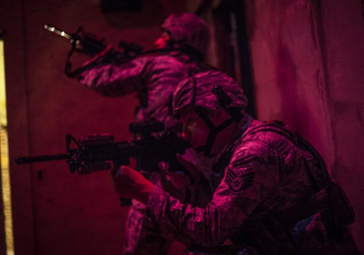 Keywords: usaf u.s. air force usairforce air national guard airnationalguard new jersey newjersey 177th security forces squadron 177thsecurityforcessquadron m4 training joint base mcguire-dix-lakehurst jointbasemcguiredixlakehurst jt2dc n.j. nj usa public domain publicdomain free indoor U.S. Air Force Staff Sgt. Christopher Raine, front, and Tech. Sgt. Anthony Lemons provide cover for teammates during training at an indoor Military Operations in Urban Terrain (MOUT) site at the New Jersey National Guard's Joint Training & Training Development Center (JT2DC), Joint Base McGuire-Dix-Lakehurst, N.J., June 16, 2016. Raine and Lemons are Security Forces specialists assigned to the New Jersey Air National Guard's 177th Security Forces Squadron. The 177th Security Forces Squadron was utilizing the ability for the JT2DC's training areas to simulate low-light conditions in an urban environment. The red and blue lighting simulates a moonlit night as seen through night vision devices. (U.S. Air National Guard photo by Tech. Sgt. Matt Hecht/Released) U.S. Air Force Staff Sgt. Christopher Raine, front, and Tech. Sgt. Anthony Lemons provide cover for teammates during training at an indoor Military Operations in Urban Terrain (MOUT) site at the New Jersey National Guard's Joint Training & Training Development Center (JT2DC), Joint Base McGuire-Dix-Lakehurst, N.J., June 16, 2016. Raine and Lemons are Security Forces specialists assigned to the New Jersey Air National Guard's 177th Security Forces Squadron. The 177th Security Forces Squadron was utilizing the ability for the JT2DC's training areas to simulate low-light conditions in an urban environment. The red and blue lighting simulates a moonlit night as seen through night vision devices. (U.S. Air National Guard photo by Tech. Sgt. Matt Hecht/Released) |