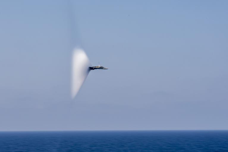 MEDITERRANEAN SEA (June 26, 2016) An F/A-18C Hornet, assigned to the “Rampagers” of Strike Fighter Squadron (VFA) 83, performs a supersonic fly-by off the port side of aircraft carrier USS Harry S. Truman (CVN 75). Harry S. Truman Carrier Strike Group is deployed in support of maritime security operations and theater security cooperation efforts in the U.S. 6th Fleet area of operations. (U.S. Navy photo by Mass Communication Specialist 3rd Class Bobby J Siens/Released) usa mediterraneansea ussharrystrumancvn75 fa18fsuperhornet strikefightersquadronvfa103 FA-18C Hornet breaks the sound barrier.jpg An F/A-18C Hornet assigned to the Rampagers of Strike Fighter Squadron VFA 83 performs a supersonic fly-by off the port side of aircraft carrier USS Harry S Truman CVN 75 Harry S Truman Carrier Strike Group is deployed in support of maritime security operations and theater security cooperation efforts in the U S 6th Fleet area of operations https //www flickr com/photos/127906254 N06/28002347551/ 160626-N-DZ642-128 2016-06-26 16 12 U S Navy photo by Bobby J Siens PD-USGov-Military-Navy Taketa 2016-07-13 F/A-18C Hornet with condensation clouds from shockwaves Aboard USS Harry S Truman CVN-75 Strike Fighter Squadron 83 United States Navy |