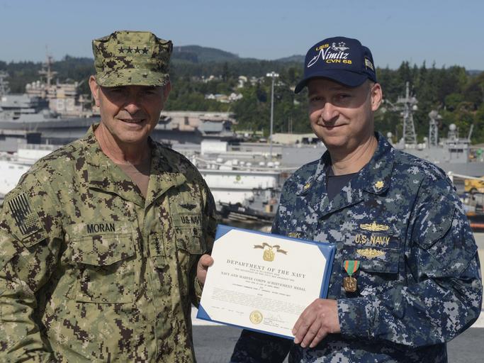 Keywords: 160725-N-DA275-082 160725-N-DA275-082.jpg en NAVAL BASE KITSAP-BREMERTON Wash July 25 2016 Lt Cmdr Evan J LaFrance receives a Navy/Marine Corps Achievement Medal from Adm Bill Moran Vice Chief of Naval Operations on the flight deck of USS Nimitz CVN 68 for responding to an electrical shock victim on the pier LaFrance directed and administered personnel and first aid on the scene while remaining on scene to direct traffic and crowd control Nimitz is currently undergoing an extended planned incremental maintenance availability at Puget Sound Naval Shipyard and Intermediate Maintenance Facility where the ship is receiving scheduled maintenance and upgrades U S Navy photo by Mass Communication Specialist 3rd Class Samuel H Bacon/Released <br>Unit Navy Media Content Services 2016-07-25 Samuel H Bacon https //www dvidshub net/image/2767578/160725-n-da275-082 160725-N-DA275-082 2016-08-04 00 38 NAVAL BASE KITSAP - BREMERTON WASHINGTON US PD-USGov-Military-Navy Naval Base Kitsap USS Nimitz CVN-68 Images from DoD uploaded by FĂŚ |