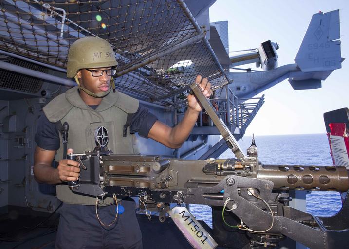 | Keywords: .50 caliber machine gun 50calibermachinegun amphibious ready group amphibiousreadygroup lhd 1 lhd1 scat sailors u.s. navy usnavy uss wasp usswasp wasp arg wasparg small caliber action team smallcaliberactionteam watch mediterranean sea mediterraneansea 160730-N-TO519-047 MEDITERRANEAN SEA (July 30, 2016) Information Systems Technician 3rd Class Kiyan Stamper inspects a .50 caliber machine gun aboard the amphibious assault ship USS Wasp (LHD 1) July 30, 2016. Wasp is deployed with the Wasp Amphibious Ready Group to support maritime security operations and theater security cooperation efforts in the U.S. 6th Fleet area of operations. (U.S. Navy photo by Mass Communication Specialist 2nd Class Nathan Wilkes/Released) 160730-N-TO519-047 MEDITERRANEAN SEA (July 30, 2016) Information Systems Technician 3rd Class Kiyan Stamper inspects a .50 caliber machine gun aboard the amphibious assault ship USS Wasp (LHD 1) July 30, 2016. Wasp is deployed with the Wasp Amphibious Ready Group to support maritime security operations and theater security cooperation efforts in the U.S. 6th Fleet area of operations. (U.S. Navy photo by Mass Communication Specialist 2nd Class Nathan Wilkes/Released) |