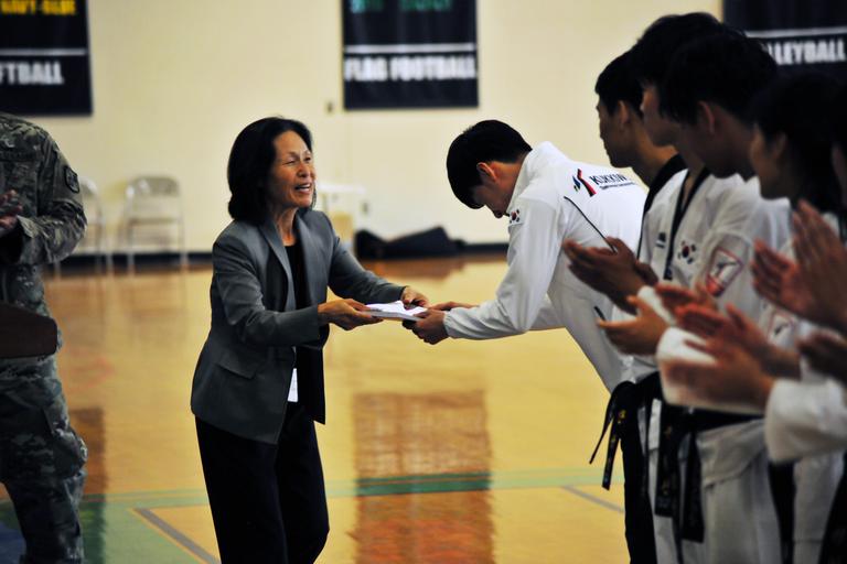 | Keywords: taekwondo u.s. army usarmy u.s. marine corps usmarinecorps u.s. navy usnavy u.s. air force usairforce presidio of monterey presidioofmonterey korea The Kukkiwon Taekwondo Demonstration Team from Korea performed a traditional martial arts demonstration at the Presidio of Monterey, California, Price Fitness Center Aug. 3. The Defense Language Institute Foreign Language Center Korean School hosted the event. Following the demonstration, the team answered questions in Korean for the benefit of the students. Kukkiwon, known as the World Taekwondo Headquarters, is the center of taekwondo culture in Korea with teams touring about 120 countries as ambassadors of the traditional martial art for the past 40 years. (U.S. Army photo by Patrick Bray/Released) The Kukkiwon Taekwondo Demonstration Team from Korea performed a traditional martial arts demonstration at the Presidio of Monterey, California, Price Fitness Center Aug. 3. The Defense Language Institute Foreign Language Center Korean School hosted the event. Following the demonstration, the team answered questions in Korean for the benefit of the students. Kukkiwon, known as the World Taekwondo Headquarters, is the center of taekwondo culture in Korea with teams touring about 120 countries as ambassadors of the traditional martial art for the past 40 years. (U.S. Army photo by Patrick Bray/Released) |