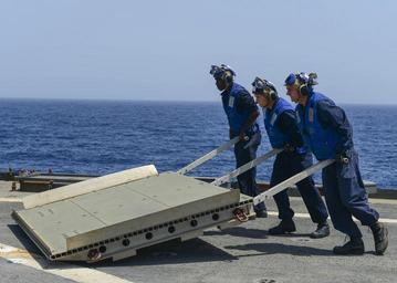 Keywords: flight deck flightdeck heat shield heatshield amphibious dock landing ship amphibiousdocklandingship uss whidbey island usswhidbeyisland lsd 41 lsd41 gulf of aden gulfofaden outdoor 160823-N-TI017-054 GULF OF ADEN (Aug. 23, 2016) Seaman Tyron Hodge, back, Boatswain’s Mate 3rd Class Joshua Schultz, middle, and Boatswain’s Mate 3rd Class Andrew Peixoto move a heat shield on the flight deck of the amphibious dock landing ship USS Whidbey Island (LSD 41). Whidbey Island is deployed with the Wasp Amphibious Ready Group to support maritime security operations and theater security cooperation efforts in the U.S. 5th Fleet area of operations. (U.S. Navy photo by Mass Communication Specialist 2nd Class Nathan R. McDonald/Released) 160823-N-TI017-054 GULF OF ADEN (Aug. 23, 2016) Seaman Tyron Hodge, back, Boatswain’s Mate 3rd Class Joshua Schultz, middle, and Boatswain’s Mate 3rd Class Andrew Peixoto move a heat shield on the flight deck of the amphibious dock landing ship USS Whidbey Island (LSD 41). Whidbey Island is deployed with the Wasp Amphibious Ready Group to support maritime security operations and theater security cooperation efforts in the U.S. 5th Fleet area of operations. (U.S. Navy photo by Mass Communication Specialist 2nd Class Nathan R. McDonald/Released) |